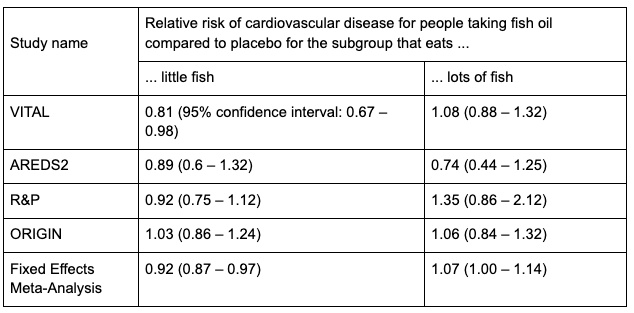 It’s also been suggested that people who eat plenty of fish benefit less from taking fish oil supplements. Four of the studies broke out results separately based on how much fish people ate. The table below looks at those four studies individually and then combines their results using fixed effect meta-analysis.