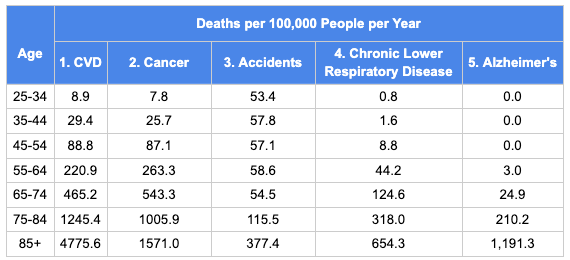 The table below has the CDC data for deaths per 100,000 people per year. I’ve combined heart disease and stroke into the single category cardiovascular disease (CVD), in line with how most papers report risk factors. Later on I’m going to break “accidents” into several sub-categories that have different risk factors (drug overdoses, car accidents, and falls).
