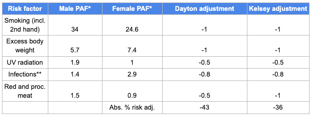 In this paper, a group of scientists at the American Cancer Society estimate what fraction of cancer cases and deaths are attributable to a list of known risk factors. In my spreadsheet, I make rough guesses for how much of each risk factor Kelsey and I have. Smoking: none, UV radiation: half of normal, and so on. My total risk is reduced 43%; Kelsey’s is by 36%. The gap isn’t because I’ve done something healthy that Kelsey hasn’t. It’s because many more cancer deaths are caused by smoking in men than in women, so by not smoking I’ve gained more relative to average than Kelsey has.