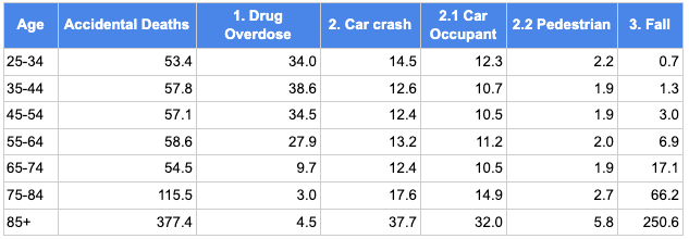 The “accidents” category is made up mostly of three groups: drug overdoses, car accidents, and falls, with a long tail of other rare accidental causes of death. Drug overdoses are the one common cause of death that declines with age. Car accident deaths increase a bit with age. Falls increase by over 350x from under 35-years-old to over 85-years-old.