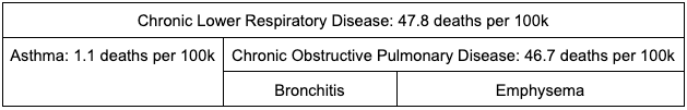 CLRD includes three conditions: bronchitis, emphysema, and asthma. The first two are grouped together under the label Chronic Obstructive Pulmonary Disease (COPD). Until 1999, the CDC, following the WHO, treated COPD and asthma as separate top-level categories. The West Virginia Department of Health and Human Resources has an excellent page describing the three conditions. Patients with COPD typically have both bronchitis and emphysema. That explains why the CDC page on CLRD just codes most CLRD deaths as “excluding asthma” without further specifying bronchitis or emphysema.